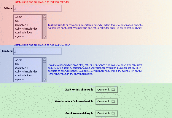 In this part of the option form, you assign access priviledge of your calendar to special users. You can grant read permission to a list of users called readers, identified by their calendar names. Calendar readers can access all event info on your calendar, however, they cannot modify them except on group events where editing permission are properly granted. You can also grant editing permission to a list of users called editors. Calendar editors can read, edit and delete all events on your calendar. They have the same access right as the calendar owner on event data.